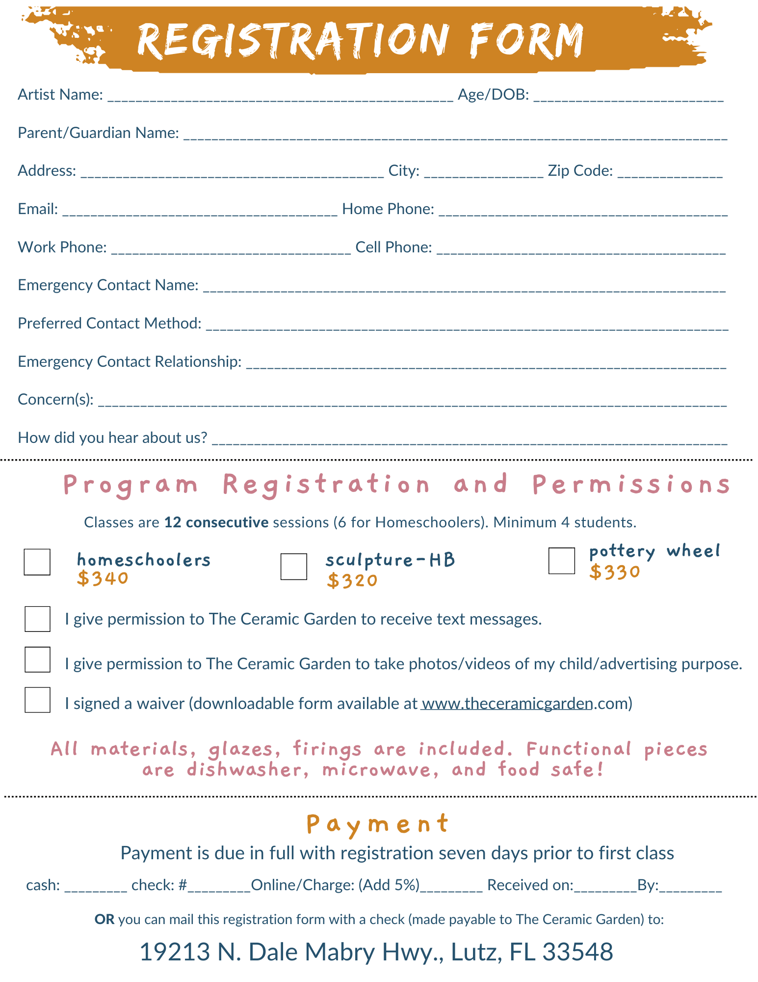 Materials, equipment, tools, unlimited clay, glazes, firings are always included!