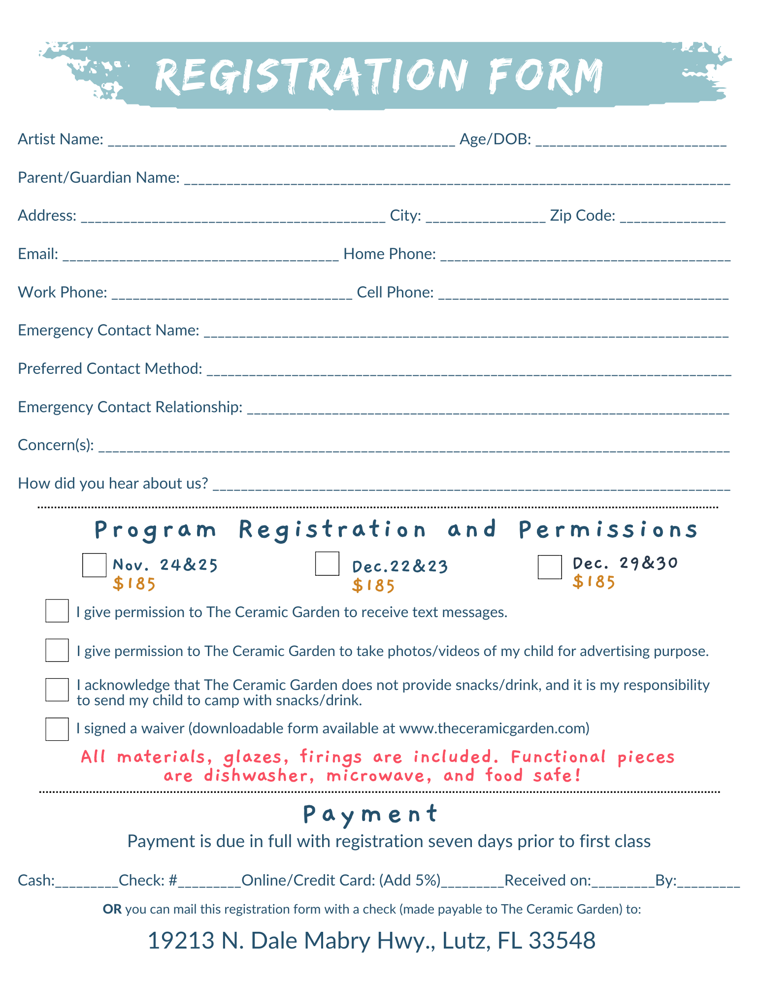 Register by purchasing the mini art camp(s) you'd like the kiddos to attend (click on picture or green bar below) and by completing the registration and waiver forms (click here, or scroll down to PDF forms to download.