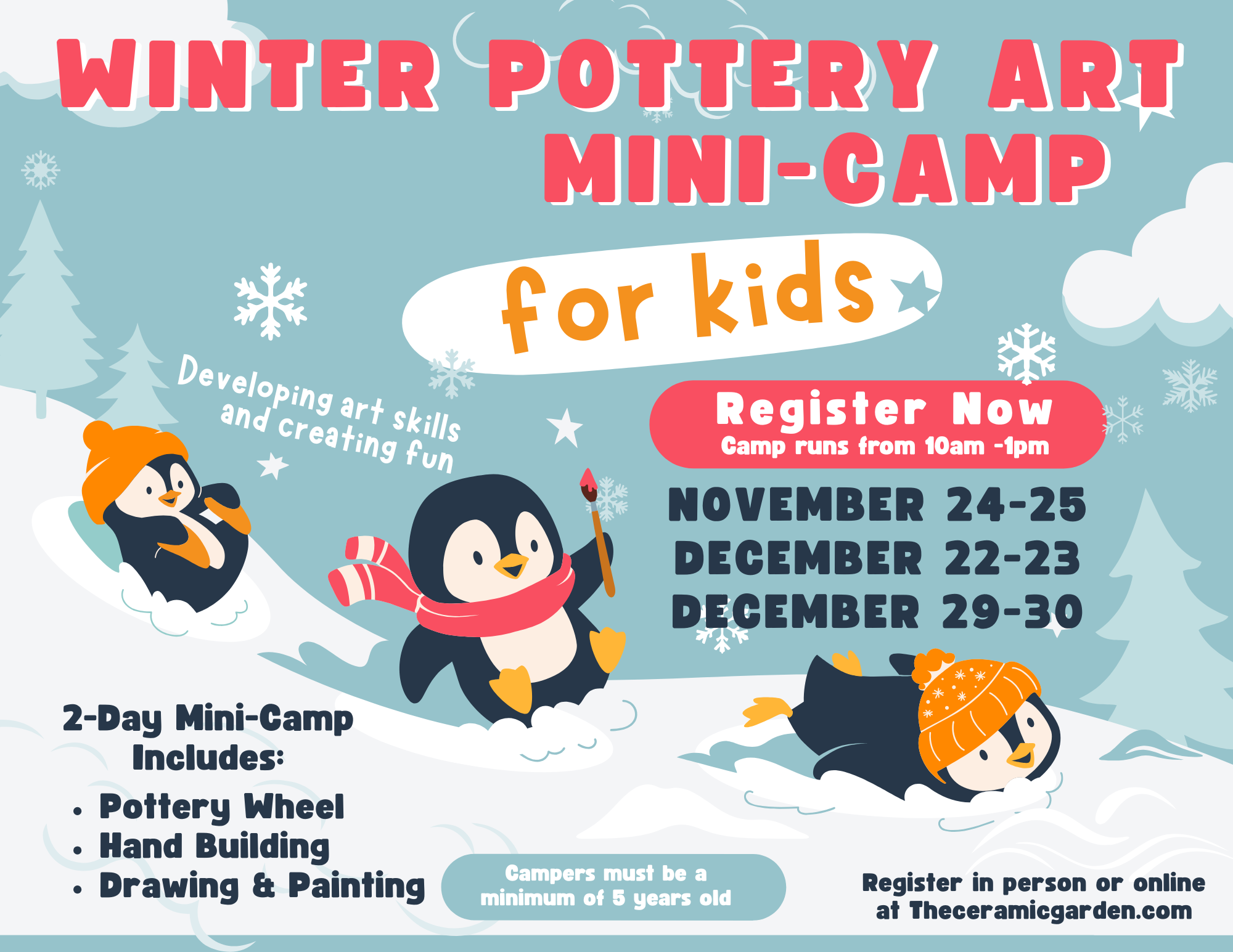 These are structured art classes with instructions and are led by professionals teaching students the basics techniques of working with clay. On the first day young potters hand build, sculpt AND throw on the pottery wheel. The second day is dedicated to painting their projects and more... It's basically a mini-version of our Summer Art Camps. As always, materials, glazes, and firings are all included.
