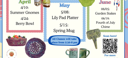Catch up with family, friends, or your date as you build a fun gnome from scratch with clay. This class is on 4/24, 5:30-8 pm. It's never too late to learn something new!