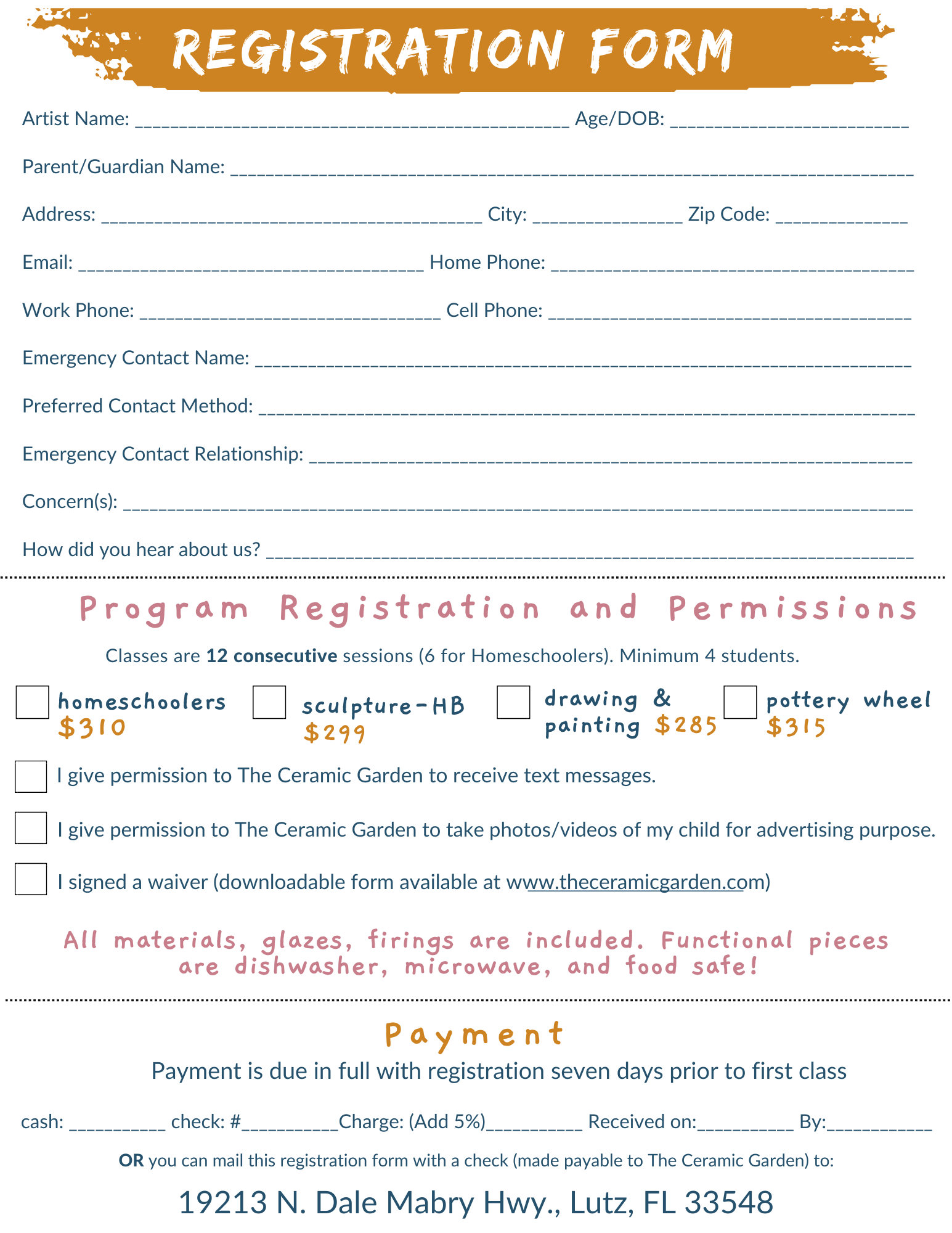 All of our Enrichment Programs include pottery wheel AND hand building with clay (8/18-11/10/25 and 1/5/26-3/30/26) and are designed for youth ages 6-12 years old. Registrations close 7 days prior to first day of class. Our Homeschoolers attend 6-week hands on programs on Mondays for advanced students (10/27-12/8), on Wednesdays for intermediates (10/29-12/10), and on Thursdays for beginners (10/30-12/11). To register, scroll down to PDF forms, download registration & waiver and submit with payment. All classes include materials, glazes, and firings.