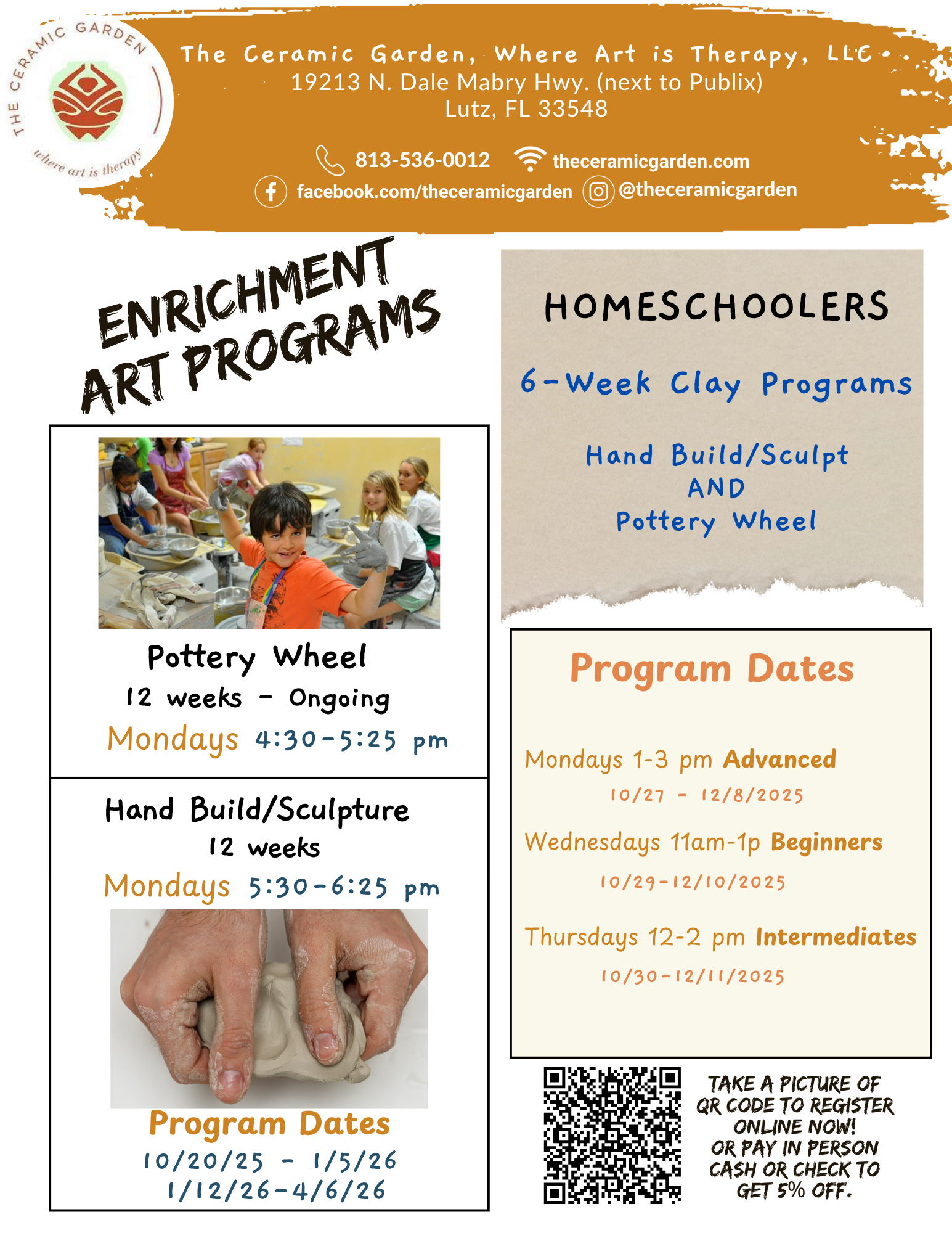All of our Enrichment Programs include pottery wheel AND hand building with clay (8/18-11/10/25 and 1/5/26-3/30/26) and are designed for youth ages 6-12 years old. Registrations close 7 days prior to first day of class. Our Homeschoolers attend 6-week hands on programs on Mondays for advanced students (10/27-12/8), on Wednesdays for intermediates (10/29-12/10), and on Thursdays for beginners (10/30-12/11). To register, scroll down to PDF forms, download registration & waiver and submit with payment. All classes include materials, glazes, and firings.