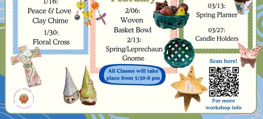 Catch up with family, friends, or your date as you build a couple of candle holders from scratch with clay. This class is on 3/27, 5:30-8 pm. It's never too late to learn about clay! No experience needed.